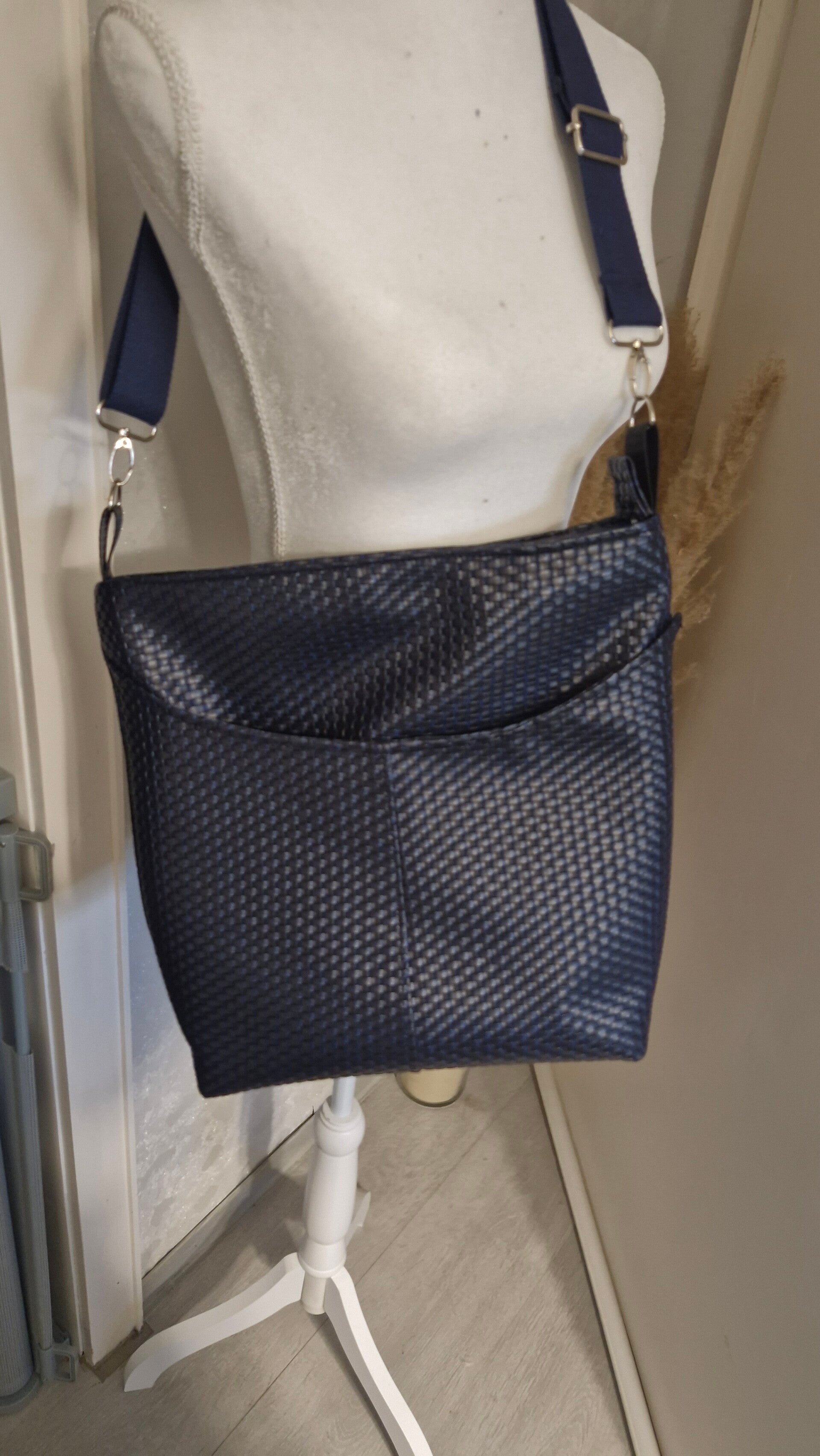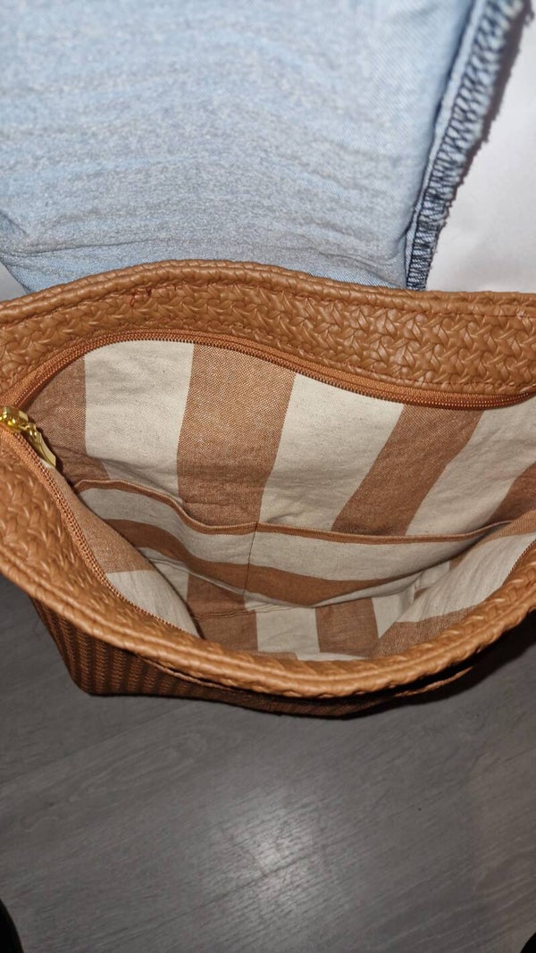 Geräumige Shoppertasche aus Kunstleder Camelfarben Geflecht , Maße 35 x34x13 cm (LxBxH)gross oder klein 26x24x19 , wahlweise mit goldenen oder silbernen Karabinern. Innen befinden sich zwei Steckfächer , außen befindet sich separates Fach welches mit Druckknopf geschlossen wird
